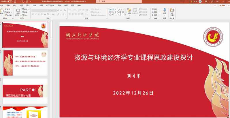 为进一步增进教学学术文化,推动基层教学组织建设,鼓励学院结合学科专业特色,开展个性化、针对性的教学沙龙和教学观摩活动,我院教学副院长刘习平于12月26日上午线上举办题为《资源与环境经济学专业课程思政建设》研讨会。学院全体专任教师参会。