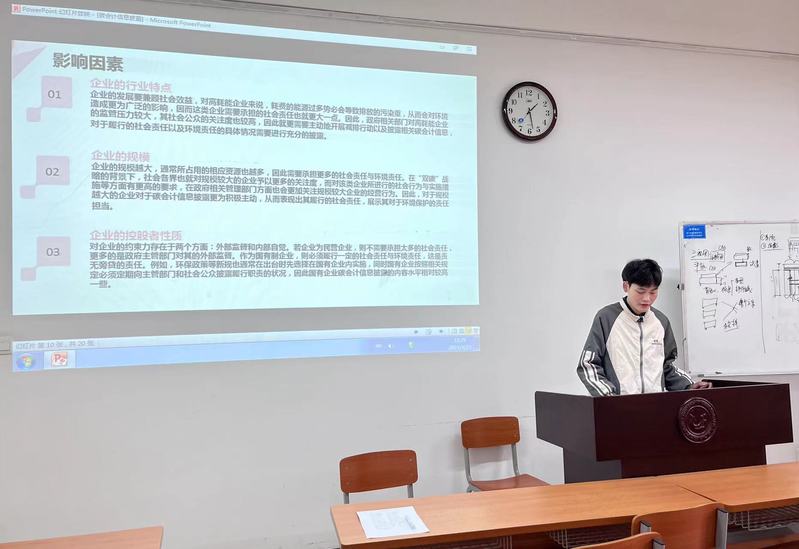 刘思雨小组汇报的内容为《上市公司碳会计信息披露》,该小组的学习内容以论文解读的形式展开,从上市公司碳会计信息披露的研究背景、文献综述、影响因素、现状及问题与内容总结五个方面进行阐述,对该论文的研究做了深入的拆分与解析。