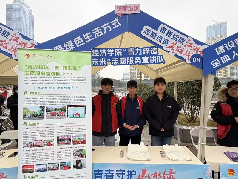 (通讯员 张旭)3月4日,在武汉江汉区西北湖广场举办的2025年武汉青年“3·5”学雷锋志愿服务集中行动“美丽武汉——青春守护山水绿,志愿点亮英雄城”活动中,我院“青力缔造,‘碳’路未来”志愿服务宣讲队受邀参展,向市民传播低碳理念,展示志愿风采。此次活动由辅导员周杰老师带队,3名队员参与其中。
