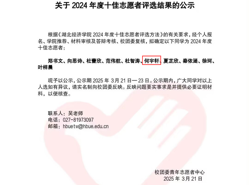 近日,学校2024年度“五·四”表彰系列评选结果揭晓,我院何宇轩同学获得“十佳志愿者”称号。