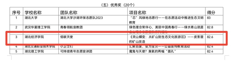 本网讯(通讯员 周杰 吕慧玲 李洁)近日,第六届湖北省高校“与绿同行”微公益环保创意大赛决赛结果公布,我校绿色低碳环保协会组建的“低碳天使”团队荣获常规类优秀奖。