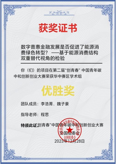 20231217日,第二届“创青春”中国青年碳中和创新创业大赛华中区域赛落下帷幕,我院低碳经济与管理专业大二学子李浩菁研究论文荣获华中赛区学术组优胜奖,指导老师为程思老师。