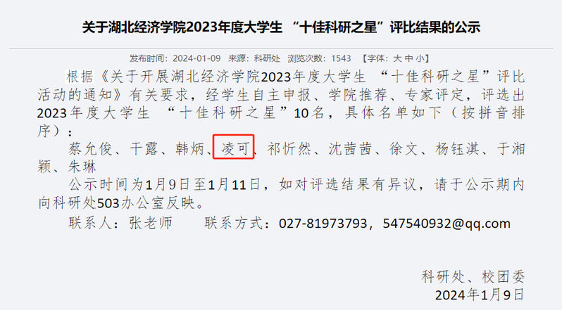 “十佳科研之星” 旨在进一步发挥科研育人功能,调动学生参与科研创新活动的积极性和创造性,展现大学生的科创能力和成果,鼓励先进典型发挥榜样引领作用。我院凌可同学代表学院参与评选,评选材料为公开发表的学术论文、学科竞赛获奖、主持的省级大创项目以及学术论坛汇报等,表现了其对专业知识的扎实掌握,展现了我院学子的科研实力和学术风采,体现了我院“以赛促学、科研育人”的教育理念。